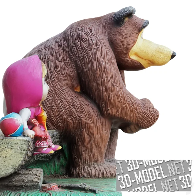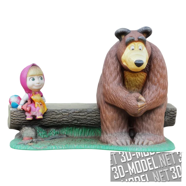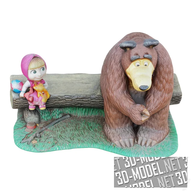 Эта скульптура изображает двух узнаваемых персонажей известного мультфильма «Маша и Медведь», сидящих вместе на деревянной скамейке. Маленькая девочка Маша в ярком розовом платочке держит в руках разноцветный мяч, а рядом с ней сидит большой бурый Медведь с добродушным выражением морды. Композиция установлена на основании, стилизованном под траву и бревно, что создает ощущение природного уголка.