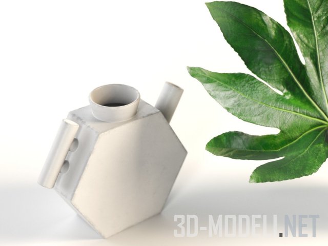 Ваза черного цвета, дополненная ветками с зелеными листьями аралии. Станет хорошим декоративным аксессуаром, вместе с оригинальным чайником в комплекте.