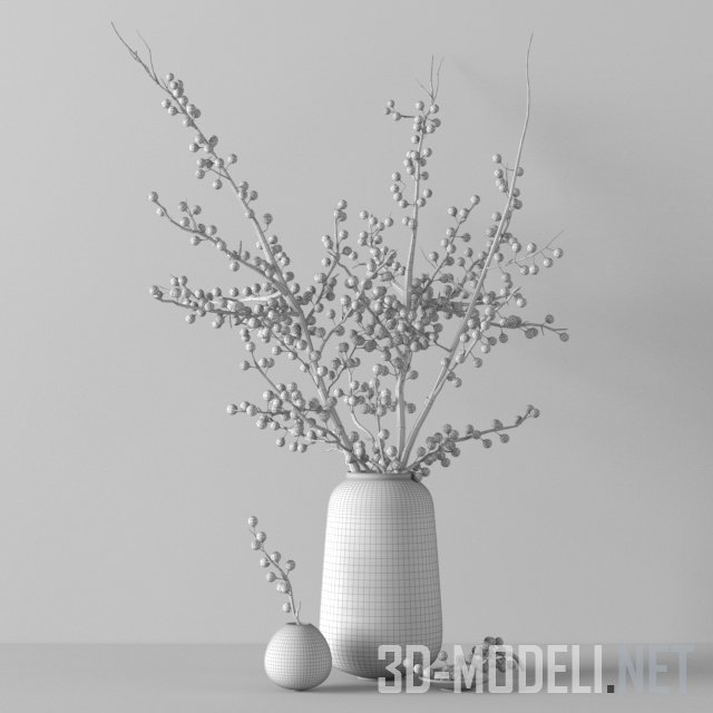 Декоративный набор: большая и маленькая вазы, блюдечко и сухие ветки с оранжевыми ягодами. Посуда выполнена из стекла, создающего эффект тонированного зеркала.