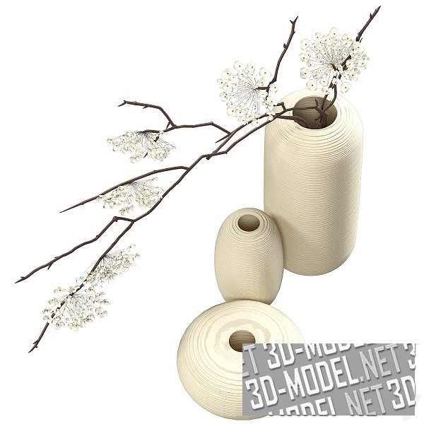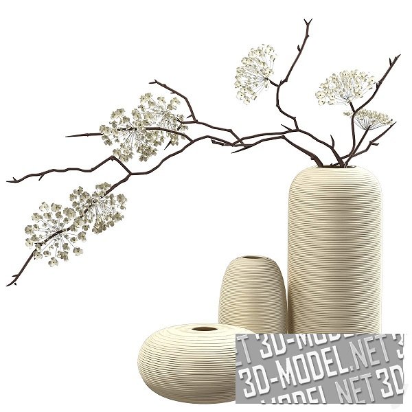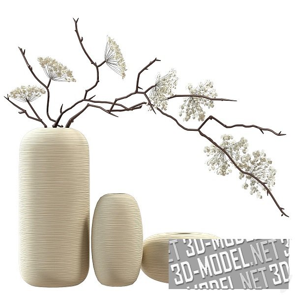 Декоративный набор из трех белых ваз в японском стиле. Вазы разной формы и размера. Поверность декорирована частыми горизонтальными бороздками. В высокой вазе размещены живописные черные ветви с зонтиками мелких белых цветов.