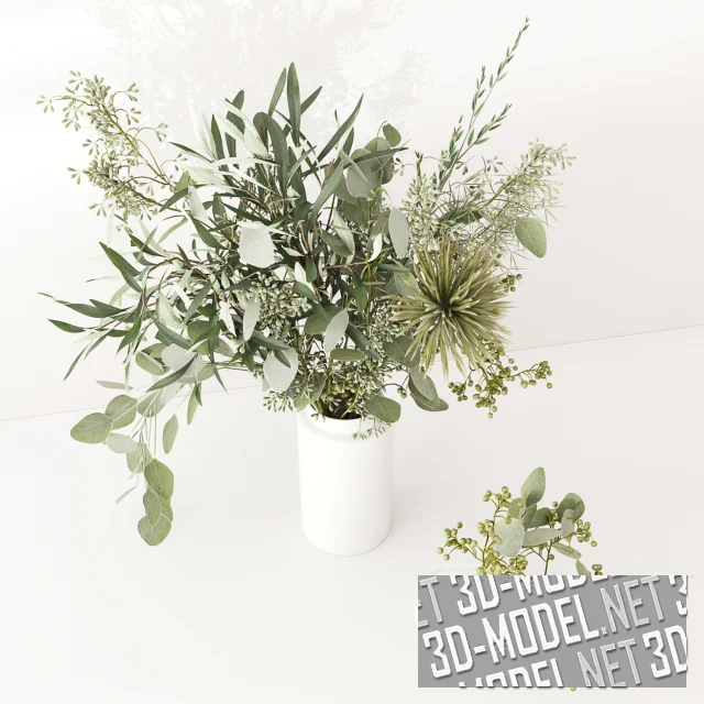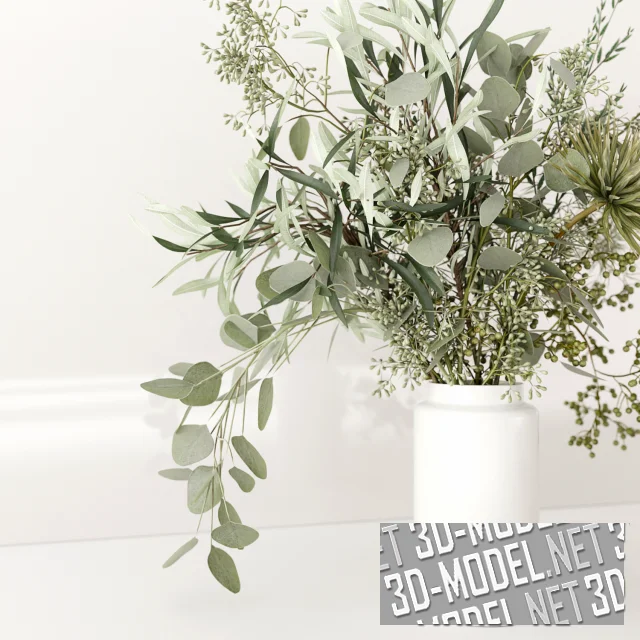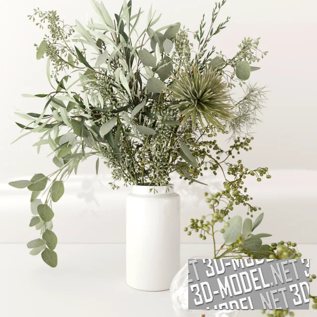 Ветки с эвкалиптом и зеленью в белой и стеклянной вазах образуют привлекательную композицию. Эти букеты отлично дополнят и освежат любую интерьерную визуализацию.