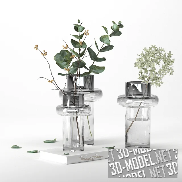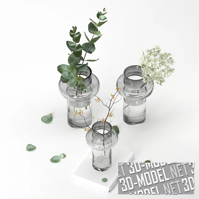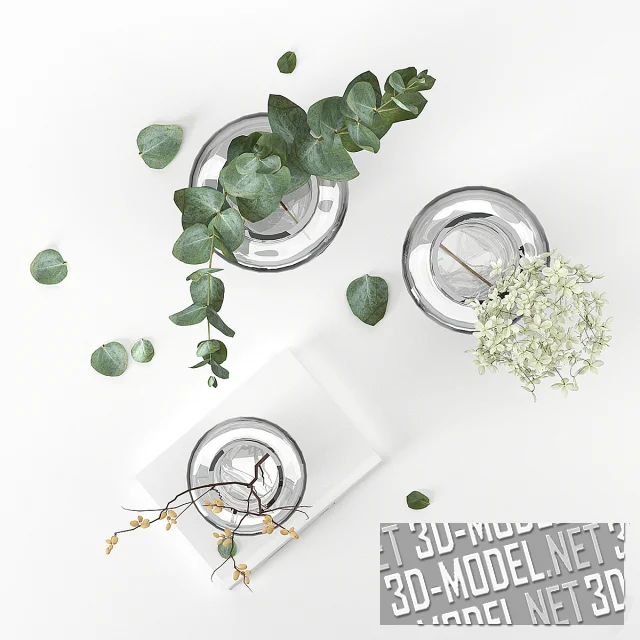 Современные вазы из стекла (с зеркально-серой тонировкой сверху, переходящей в прозрачное стекло снизу). В верхней трети высоты цилиндра ваз создан скругленный выступ. Представлено три вазы разного типоразмера. В вазах: ветка с мелкими желтоватыми ягодами, зеленые ветки эвкалипта-цинереи, цветок зеленовато-белой гортензии на веточке. Под меньшей из ваз - книга в жесткой белой обложке. Вокруг - опавшие зеленые листики эвкалипта.