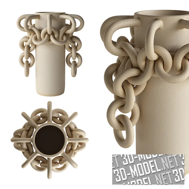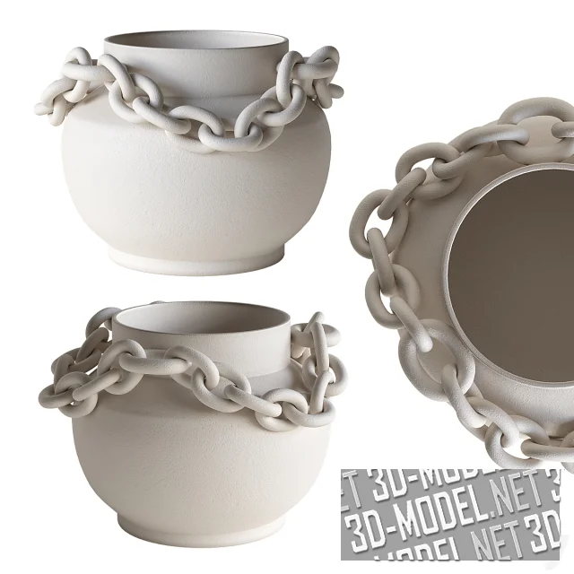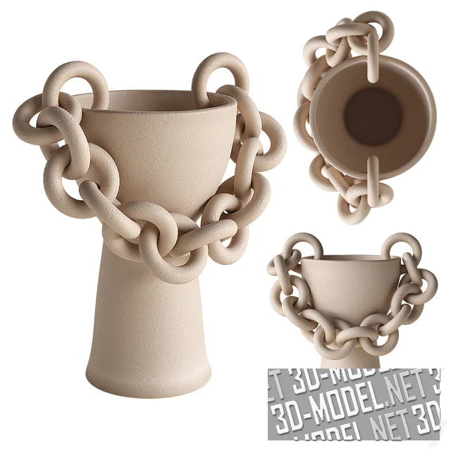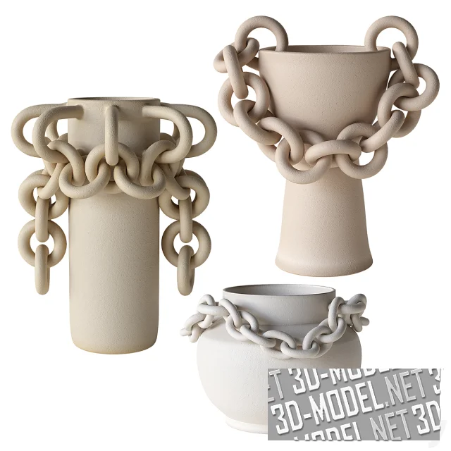 Вазы Chained vessel от JII Studio (дизайнер: Samantha Jiyeon Choo) из матовой керамики белого, светло-бежевого и светло-охристого цветов, с имитацией кованых из металла изделий. В трех вариантах ваз основная часть изготовлена в виде традиционных сосудов разной формы. Сосуды дополнены цепями, живописно огибающими основную часть. Звенья цепи двух видов: с круглыми или овальными кольцами.