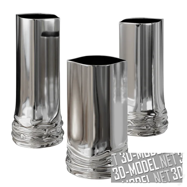 Современные минималистичные вазы из полированного металла Crash от Zieta. Выполнены в виде металлических вертикальных труб листообразного сечения, «смятые» в нижней своей части. Представлены вазы трех типоразмеров: d19/h35см, d19/h30см, d19/h25см.