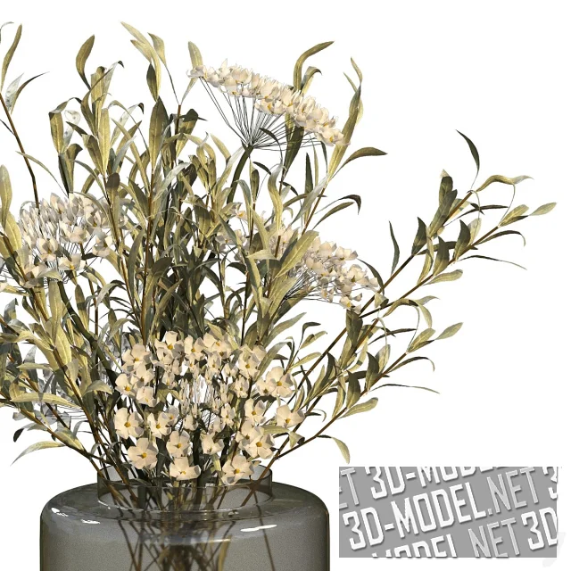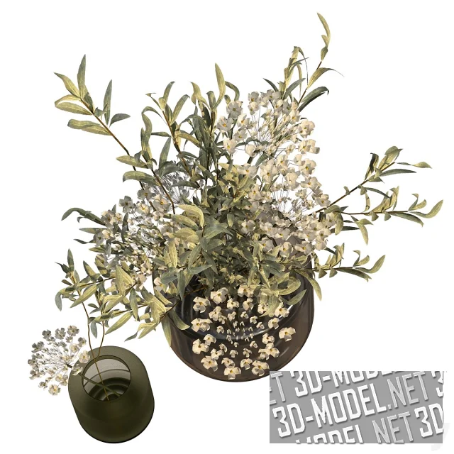 Белые цветы с зонтичными соцветиями и оливковые ветки в двух вазах Konstfull от Ikea. Вазы отличаются габаритами и стеклом. Маленькая ваза (d9/h10см) изготовлена из матового стекла серо-зеленого цвета, большая (d18/h16см) из глянцевого, полупрозрачного, тонированного в темно-серый цвет.