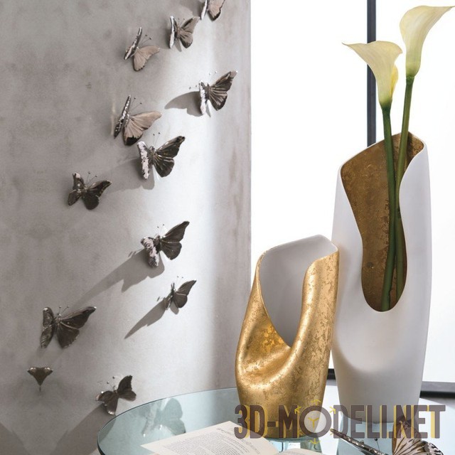 Ваза от итальянской компании Adriani Rossi – «Calla», снаружи может быть покрыта сусальным золотом или серебром, внутри цвет белый матовый, и наоборот. Высота вазы 40 см или 60 см. При использовании этой 3d-модели в визуализации интерьера следует учитывать, что керамическая матовая отделка вазы не подходит для сдерживания жидкостей, и поэтому для декора нужно использовать интерьерную зелень.