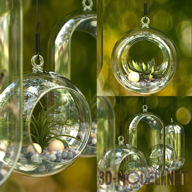 3d модель подвесных стеклянных ваз, которые станут отличным украшением любого интерьера. Вазы немного отличаются по форме и размеру, и дополнены декором в виде мелких камней и зеленых растений.