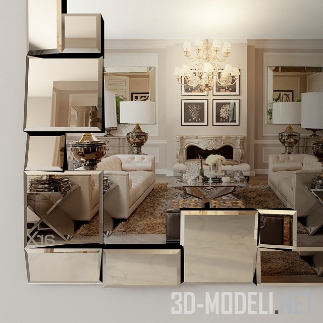 Современное большое прямоугольное зеркало производства Турция. Его отличительной и весьма оригинальной особенностью является рама, состоящая из квадратных зеркал разного типа размера.