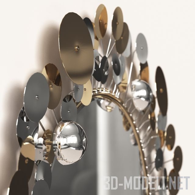 Настенное зеркало диаметром 91 см, модель с поэтическим названием «капли дождя» (Raindrops) от дизайнера Curtis Jere. Зеркало в оригинальной раме из множества металлических кружочков.