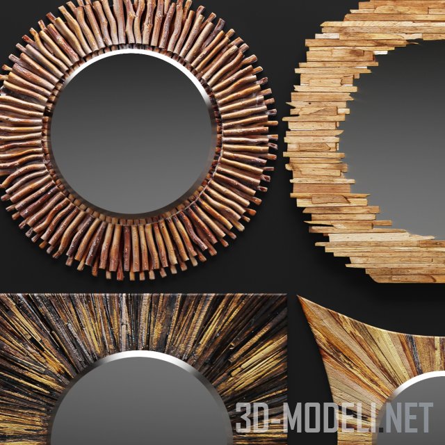 Четыре круглых зеркала с рамами из кусочков дерева: обрезков веток, брусочков, щепок. На первом (Mirrors Wildon Home ® SKU: CST17845 D-500мм.) рама изготовлена из натуральных веток одинакового размера, закрепленных в виде густых лучей вокруг зеркала. На втором (Dessert Heat Mirror by Groovystuff D-800мм.)- горизонтально уложены разноразмерные и разнородные струганые брусочки. Они образуют еще один круг вокруг зеркала. На третьем (Mirrors Gild SKU: AERT1179 D-800мм) – расходящиеся плотно уложенными лучами щепки формируют квадрат с груглым зеркалом в центре. Дополнительно щепки обработаны пламенем, что выделило и привнесло дополнительную тонировку композиции. На четвертом зеркале (Mirrors Gild SKU: AERT1181 D-900мм), плотно уложенные лучи-рейки снаружи обрезаны в четырехлучевую звезду с плавными переходами между лучами.