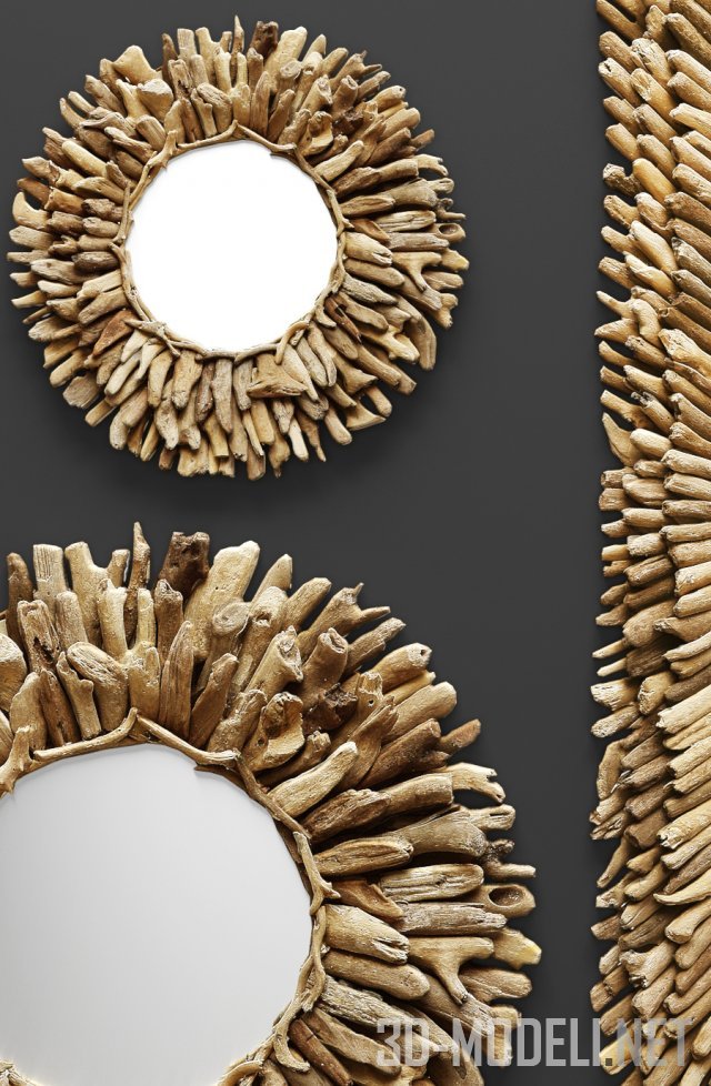 Круглое и прямоугольное зеркала Seaside от Creative Co-Op. Изюминкой коллекции являются рукотворные рамы, собранные из небольших палочек с берега моря. Кусочки дерева немного огальтованы волнами и проморены морской водой. На круглых зеркалах палочки составляют три ряда «лучей», образующих солярный символ. На прямоугольном зеркале ветки уложены подобным образом, в три ряда.