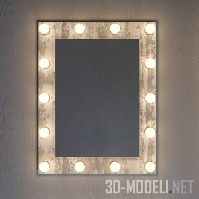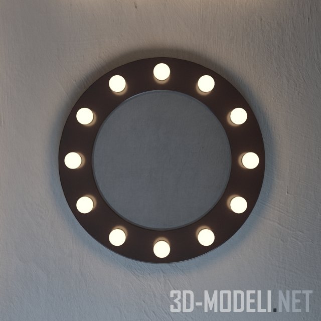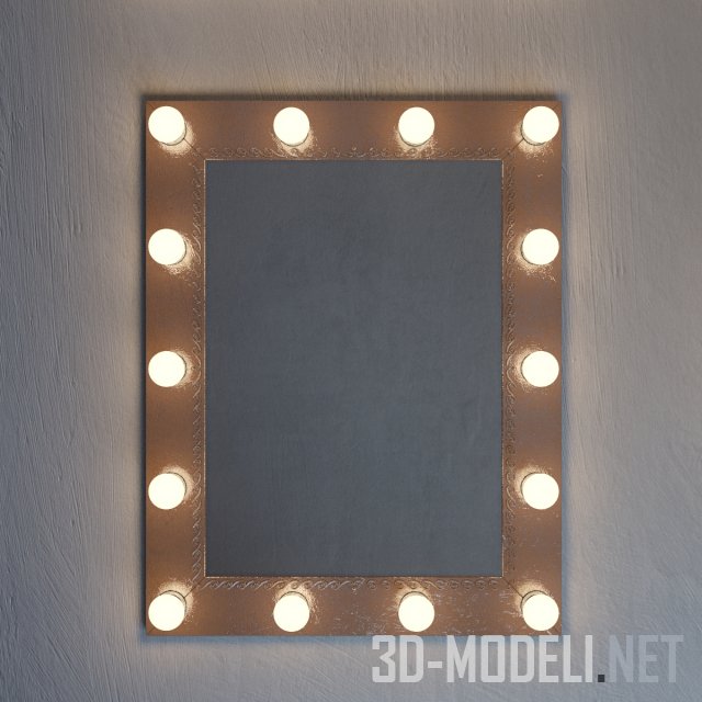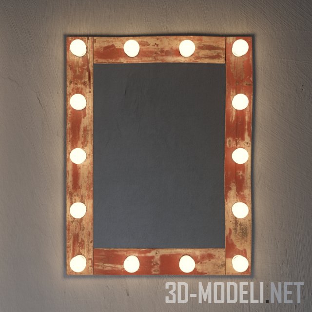 Четыре варианта зеркала для нанесения макияжа. Три зеркала прямоугольной формы в рамках коричневого, красноватого и белого цвета. На рамках по периметру смонтированы специальные лампочки. Одно зеркало круглой формы, в раме шоколадного цвета.