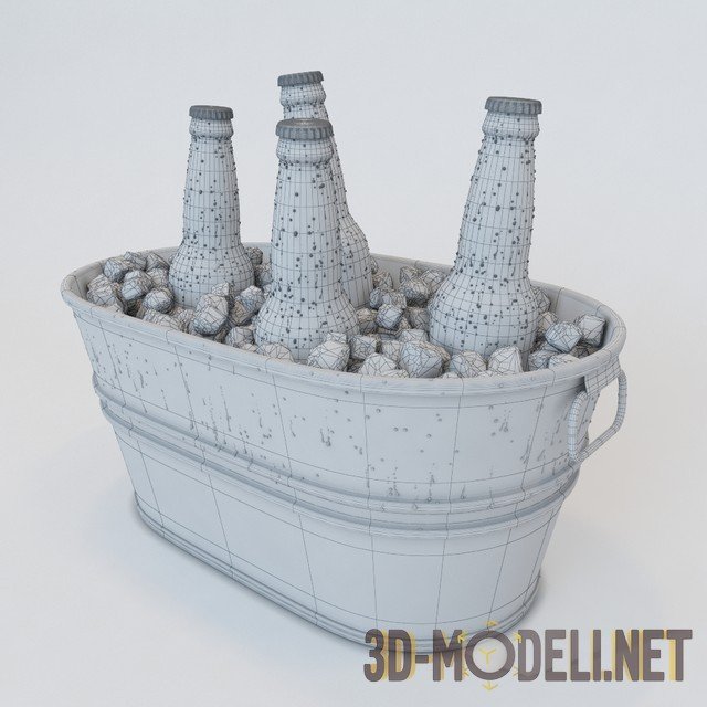 Четыре бутылки со светлым пивом, помещены в емкость, наполненную льдом. Композиция станет освежающим дополнением к любому соответствующему проекту.