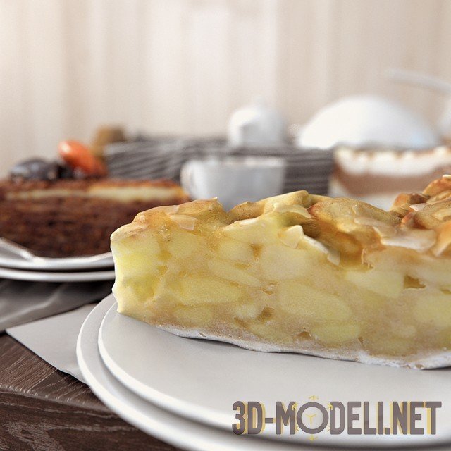 Несколько десертов с кофе: это кусочек медового торта, порция нежного чизкейка и кусочек яблочного пирога. В набор также входит деревянный поднос с полотенцем, салфетки и различная керамическая посуда: чайник, молочник, тарелки, чашки с ароматным кофе.