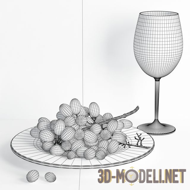 Бокал белого вина и зелёный виноград на белом блюде. Композиция с успехом может быть использована для иллюстрации рекламы виноделия или для дополнения современного интерьера кухни или гостиной.