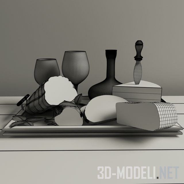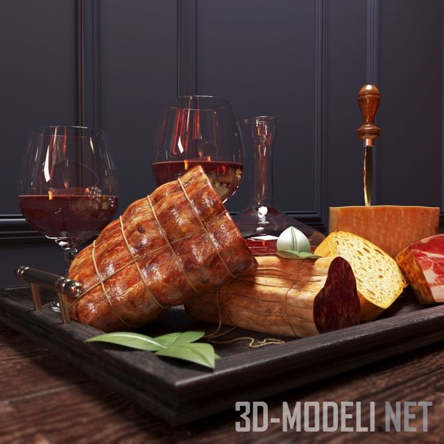 Высокого качества трехмерная модель, с настроенными материалами и текстурами набора продуктов, который украсит любой проект. В основе композиции мясо, аппетитность которого хорошо подчеркивает изрядный кусок сыра с воткнутым в него ножом, ноздреватый хлеб и бутылка вина с парой бокалов, в которых напиток уже ждет гостей.