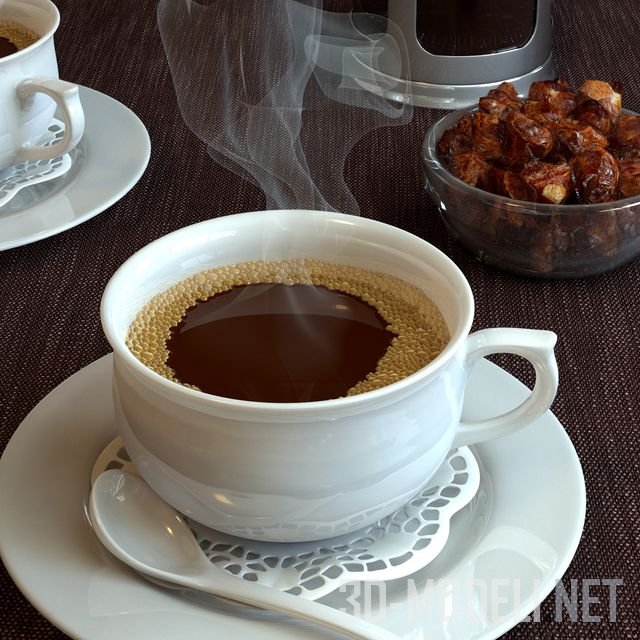 Качественная и детально проработанная трехмерная модель набора, в который входят чашки, наполненные горячим кофе, а также кофейник и тростниковый кусковой сахар в стеклянной розетке. На блюдце под каждой чашкой лежит ажурная салфетка. Если кто еще не проснулся полностью, то набор поможет взбодриться и зарядиться энергией.