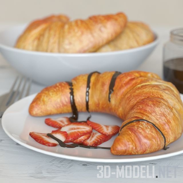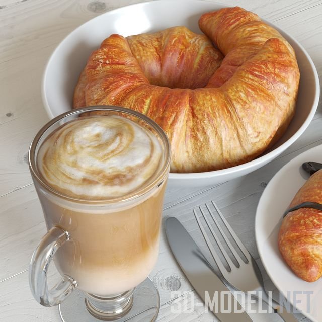 Необыкновенно аппетитный сет для воскресного завтрака: кофе латте в стеклянной чашке и две тарелки с круассанами. На одной лежат два целых, а на другой румяный, уже разрезанный круассан, политый шоколадом. Ломтики свежей клубники придают этой реалистичной 3D модели еще большую достоверность.