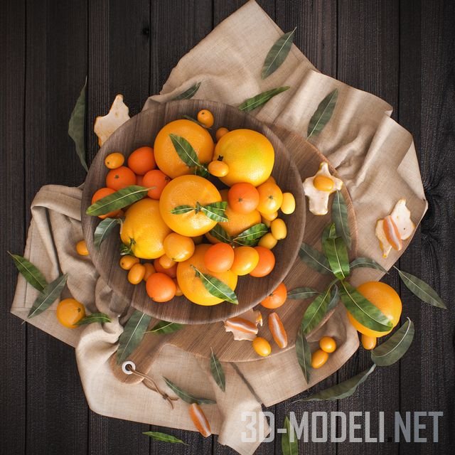 3d модель высокого качества, повышенной спелости и небывалой сочности – сладкие апельсины и мандарины в миске. Набор цитрусовых дополнен деревянной разделочной доской и салфеткой из грубого холста, что смотрится очень органично. Архив содержит файлы 3ds Max 2012 (Corona и Vray), fbx, текстуры.