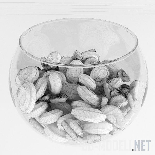 Круглая стеклянная ваза, в которой насыпаны аппетитные красные и оранжевые леденцы. Реалистичная 3d модель.