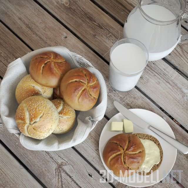 Реалистичный сет, от которого веет ароматом свежей сдобы – белая плетеная корзинка с крахмальной салфеткой наполнена мягкими булочками. Свежее масло и молоко является идеальным дополнением к булочкам. Высокого качества трехмерная модель с текстурами в архиве.