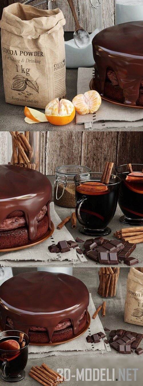 Вкусный набор для согревающего эффекта – шоколадный торт, кусковой шоколад, апельсин, палочки корицы и глинтвейн.
