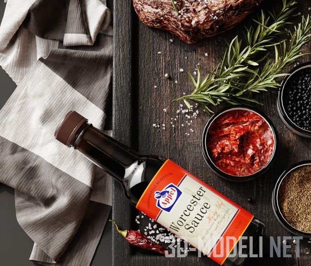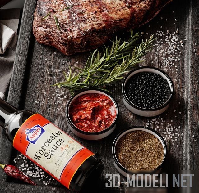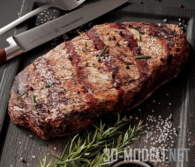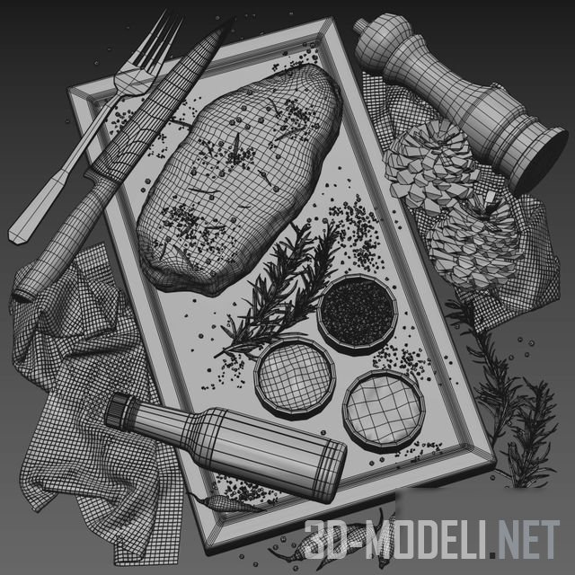Идеальная модель для мясоедов – сочный, только что приготовленный мясной стейк. Поднос из темного дерева служит идеальным фоном для мяса, столовые приборы рядом уже сверкают хищным блеском. Веточки розмарина, соус, другие специи подчеркивают аромат стейка. Салфетка и еловые шишки красиво декорируют сет.