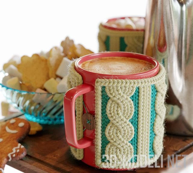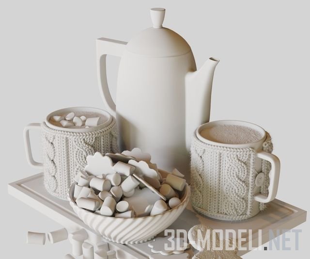 Невероятно привлекательный, вкусный набор, в состав которого входит напиток какао и сладости (зефир, печенье). В комплекте с кружками в вязаных чехлах, все элементы смотрятся очень реалистично и уютно. Для просмотра крупным планом следует включить модификатор Displace. Модель отличает высокая детализация, что подходит для съемки крупным планом.