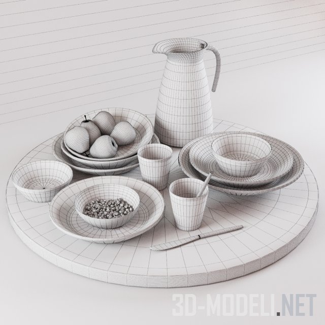 Сет для декора кухни. Большая круглая деревянная доска, на которой стоит бело-голубой кувшин, бело-голубые и бело-желтые тарелки и мисочки, стаканы и нож. В одной из тарелок лежат крупные спелые груши.
