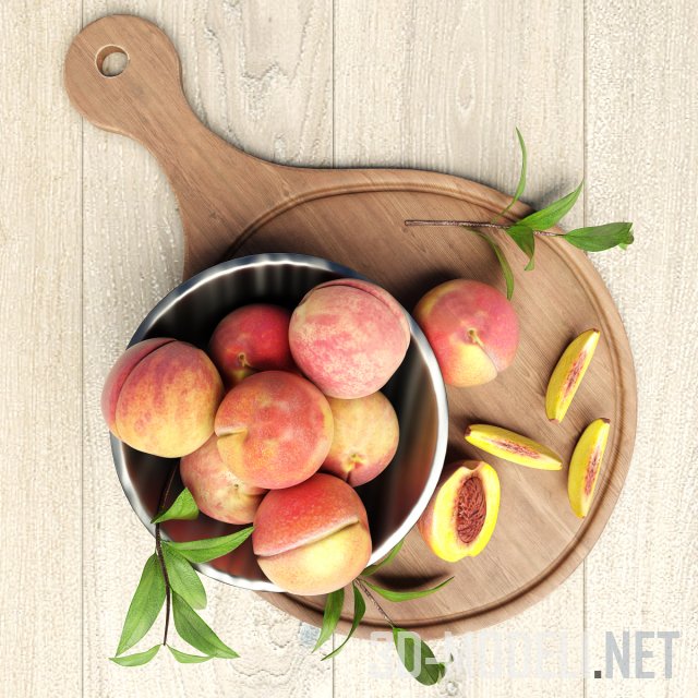 Аппетитный сет, в основе которого круглая деревянная доска (на ней лежит один целый персик, один разрезанный пополам и несколько долек), а также ваза с румяными аппетитными персиками. Зеленые листья добавляют красок в этот чудесный набор.