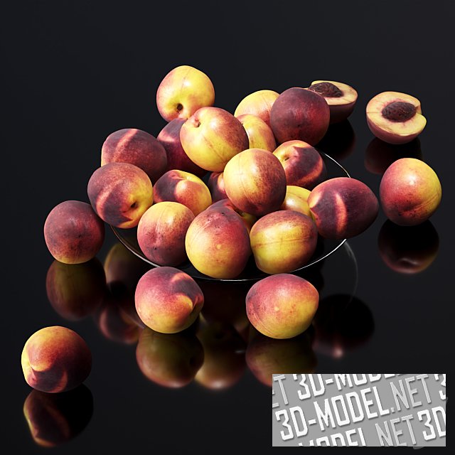 Современный натюрморт со стеклянной тарелкой, наполненной спелыми, желто-бордовыми персиками сорта Нектарин, с гладкими боками. Несколько целых плодов и разломленный пополам лежат вне тарелки, на глянцевой поверхности. Диаметр блюда - 25см.