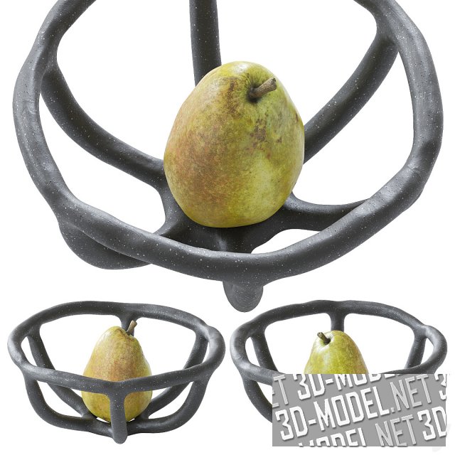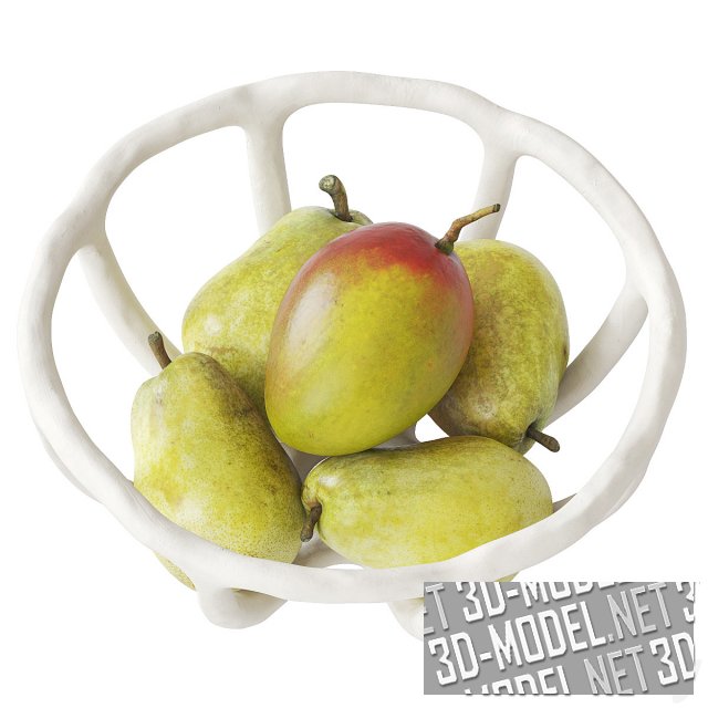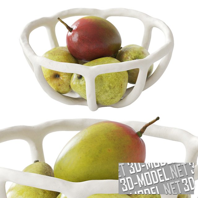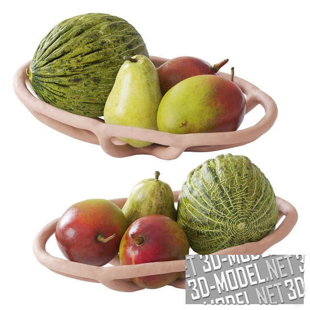 Несколько современных декоративных гнездовых ваз (три цвета и размера) с фруктами. В вазах лежат аппетитные манго, груша и дыня. Габаритные размеры: