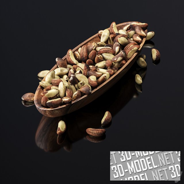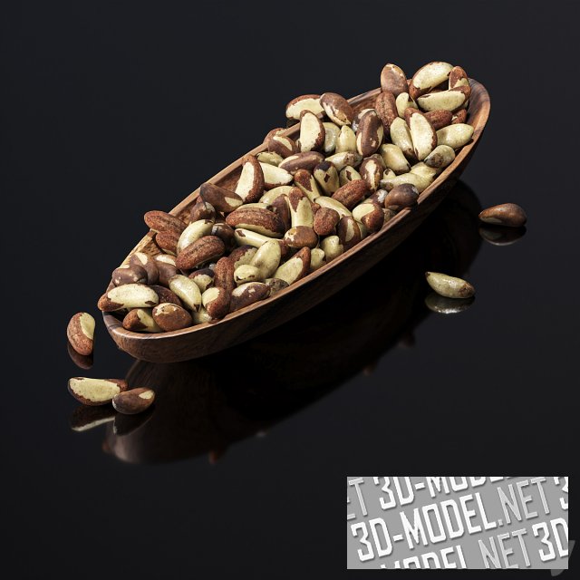 Деревянное продолговатое блюдо в форме лодочки коричневого цвета, наполненное бразильскими орехами. Несколько орешков лежит рядом на плоскости. Можно использовать в интерьере кухни или столовой.