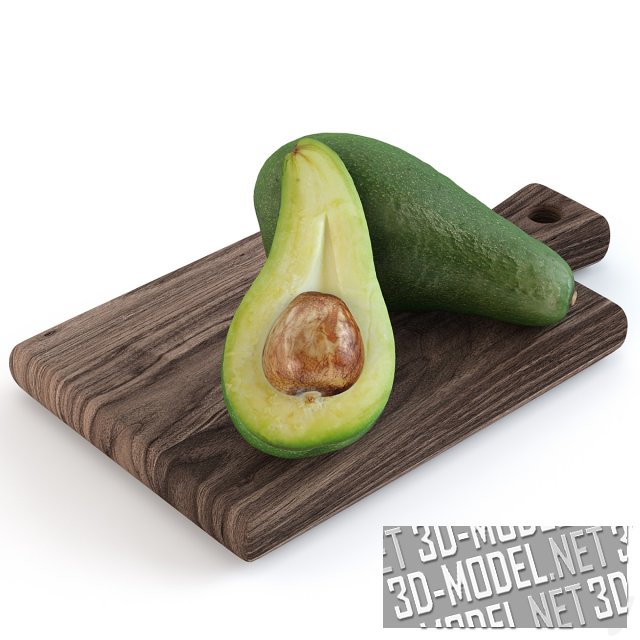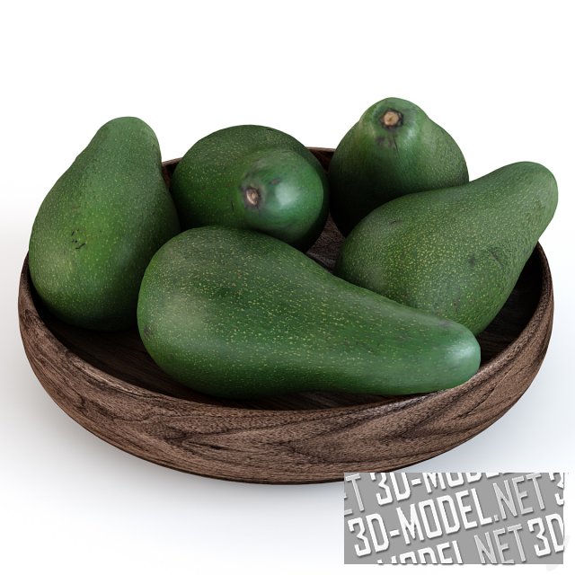 Разделочная доска и круглое блюдо из дерева коричневого цвета с характерной структурой. На блюде лежит пять крупных зеленых плодов авокадо. На разделочной доске еще целый плод и половинка с коричневой косточкой в светло-зеленой мякоти.