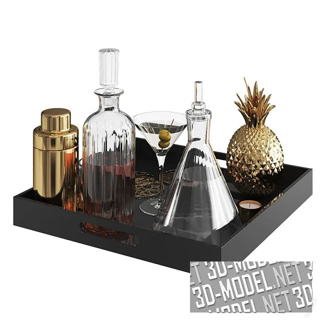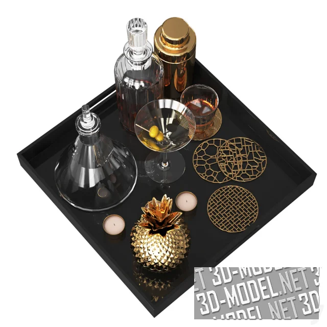 Набор различных элитных алкогольных напитков в графинах представляет собой мини-бар на подносе. Эта композиция успешно впишется в различные визуализации.