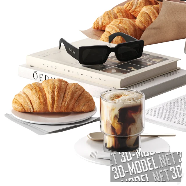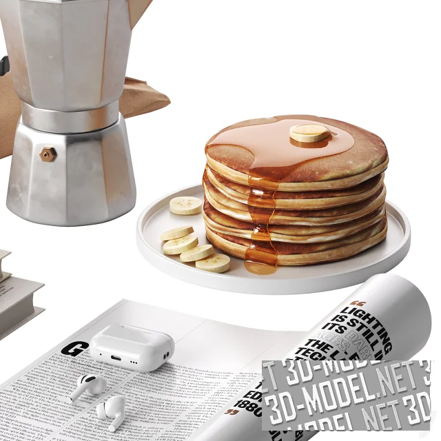 Вкусный французский завтрак с кофе и круассанами. «Блинный торт» полит медом и украшен нарезанными банановыми кружочками. Дополняет сет журнал, книги и очки.