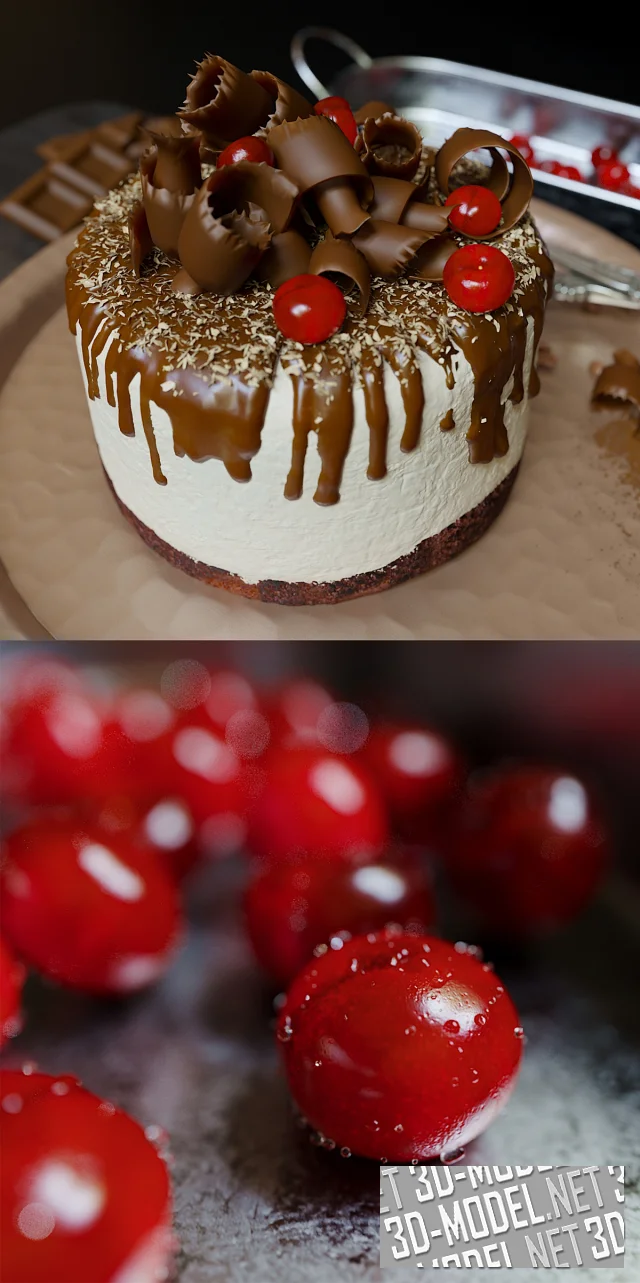Современный натюрморт с тортом, декорированным шоколадной глазурью, шоколадной стружкой и ягодами вишни. Торт размещен на круглом металлическом подносе с молотковым эффектом. Рядом на подносе - серебряные вилка и нож с барочными рельефными орнаментами.