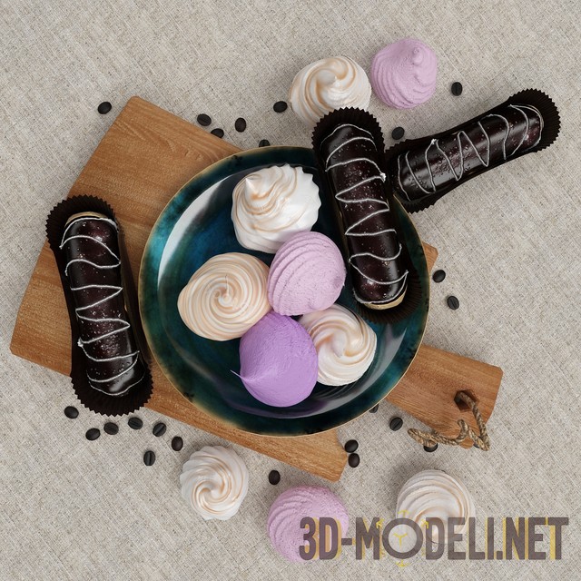 3d модель набора сладостей. Это заварные пирожные с шоколадной глазурью и зефир, белый и розовый. Все вместе, красиво уложенное на деревянной доске, смотрится невероятно вкусным, и, конечно же, такой десерт сможет сделать интерьер еще более аппетитным и реалистичным.