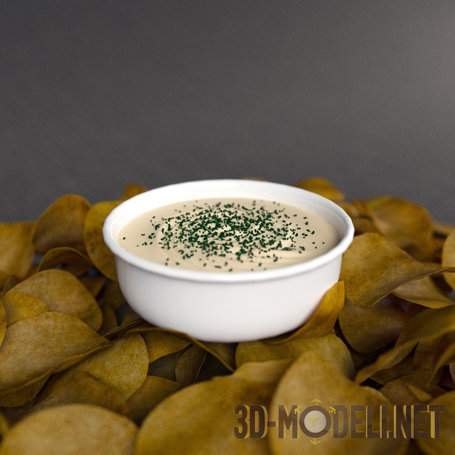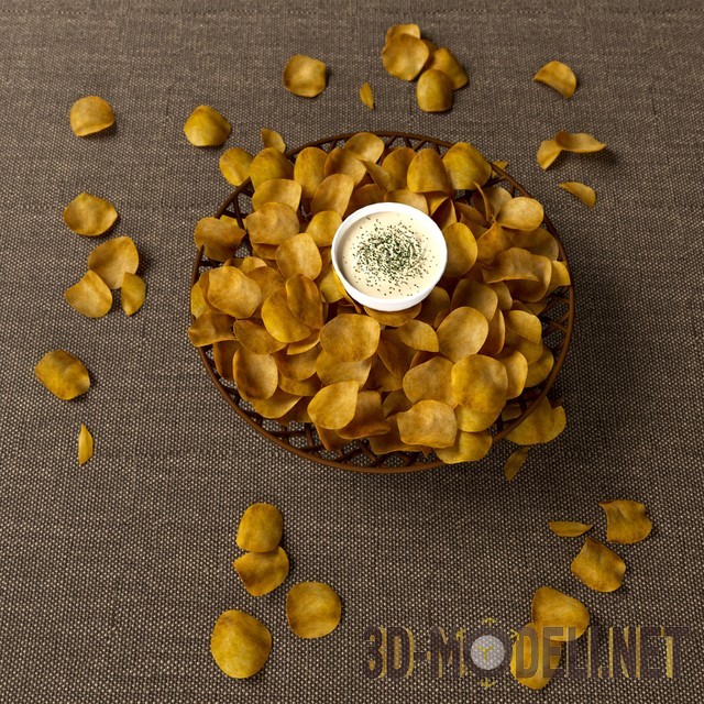 Хорошего качества 3D-модель аппетитных картофельных чипсов с чашкой майонеза. Такой набор придаст реалистичности любому проекту.
