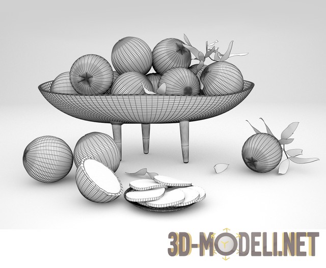 3D модель черной чугунной вазы, стоящей на трех небольших ножках, наполненной яркими оранжевыми апельсинами. Рядом с вазой еще три апельсина, два целых и один порезанный на дольки. Зеленые апельсиновые листья красиво дополняют эту композицию. Размер: 13 х 28 см. Формат: 3ds max 2010 + fbx (рендер Vray). Все текстуры есть.