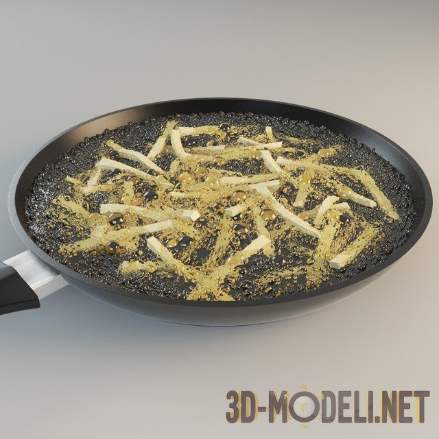 Очень популярное блюда: это картофель фри на сковороде. Фри жарится в большом количестве масла, что отражено в модели. Архив содержит текстуры и файл в формате 3ds max 2014, fbx. Рендер Vray