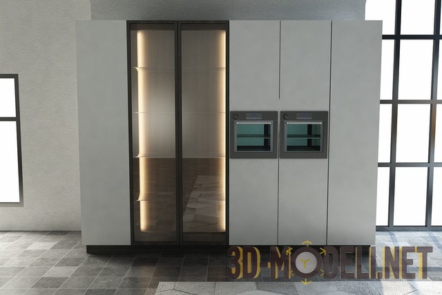 Готовый современный интерьер кухни в стиле минимализм, укомплектованный кухонной техникой. Лаконичные формы простых белых секций мебели сочетаются со светлым деревом фартука и графитовыми оттенками на стенах и плиткой на полу. Дополняет интерьер ковер, сшитый из ромбов оттенков серого, а над столиком свисают три небольших светильника.