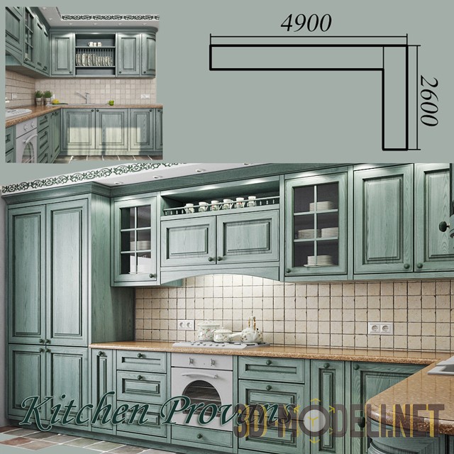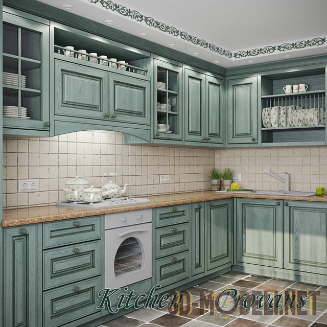 Кухонный гарнитур полынного цвета в стиле прованс. Филёнчатые фасады патинированы, укомплектованы небольшими круглыми ручками. Фартук отделан мелкой плиткой 10 х 10 см, цвета слоновой кости, с рустикальной, песочной поверхностью. Столешница сделана из охристого мрамора с мелкой текстурой. Бордюр на гипсокартоном потолке с рядами встроенных белых светильников украшен тёмно–зелёным растительным орнаментом. Встроенный духовой шкаф стилизован с помощью круглого смотрового окошка со срезанным нижним участком и специфической формой ручек управления. На варочной панели стоит набор кастрюль и чайник, декорированные мелкими цветами. В таком же стиле выполнены и тарелки, стоящие на полках в сушке, а также чашки. Размеры кухни: 260 х 490 см