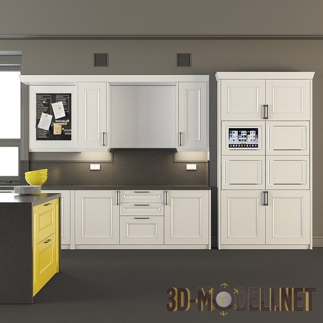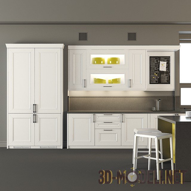 Современный белый кухонный гарнитур с классическими нотками. Фасады створок украшены небольшой филёнкой, формирующей плоскую рамку вокруг каждого фасада. Гарнитур включает в себя большой двухсекционный шкаф с четырьмя створками и встроенным двойным холодильником, нижним ярусом, составленным из тумб и выдвижных ящиков, верхним ярусом с витринами и глухими створками, островная часть с жёлтыми фасадами на выдвижных ящиках и графитовыми плоскостями боковин и столешницей, а также ещё один двухсекционный шкаф под встроенную кухонную технику.