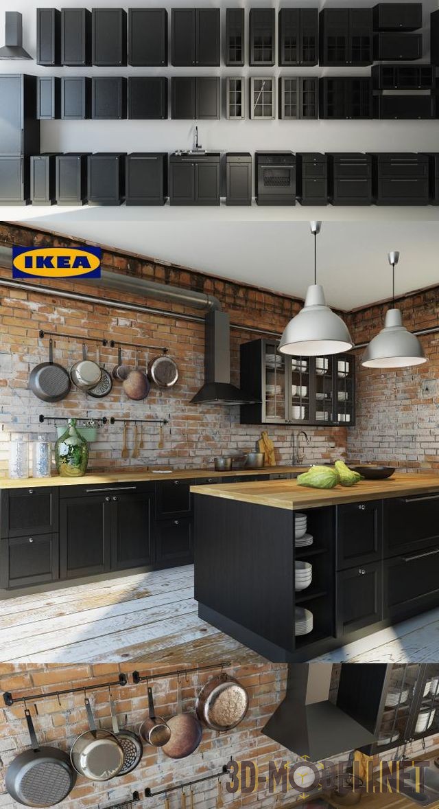Красивая кухня черного цвета Laxarby производства IKEA. Кухня с островом, мебель выполнена в актуальном в винтажном стиле и содержит все возможные варианты модулей, что делает ее очень функциональной. Ручки на мебели FAGLAVIK. В комплекте вытяжка VINDRUM, варочная поверхность BARMHARTIG, духовка RUTINERAD, кран Ringskar, мойка BOHOLMEN, светильник Foto 500 mm, а также посуда, труба вентиляции, и различные аксессуары для кухни: чугунные сковородки, тарелки, кастрюли, бутыли, кабачки и др.