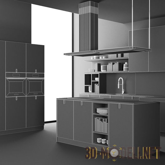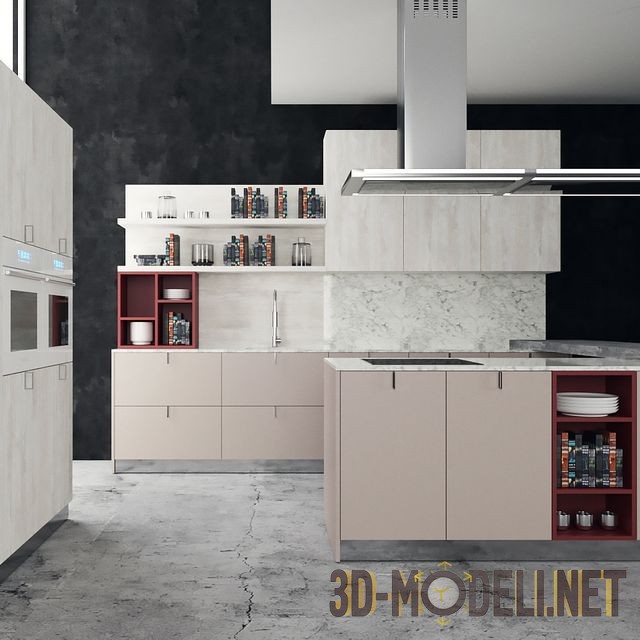 Кухонный гарнитур с фасадами Alvic, оформленными в стиле лофт. Декоры фасадов, кухонного фартука и столешниц имитируют светлый мрамор, рустикальный травертин и бетон. В наличии – красно–коричневые секции с открытыми полками. Мебельные секции смонтированы тремя боксами: островом с варочной поверхностью, системы хранения со встроенной техникой и рабочей поверхностью с мойкой и навесными шкафами и полками. Роль обеденной поверхности исполняет толстая столешница с высокими барными табуретами.