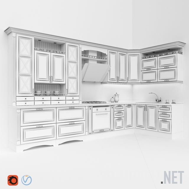 Приятная деревянная кухня серого цвета, в классическом стиле. В этой модели кухни органично сочетаются сплошные филенчатые дверцы и фасады ящиков с застекленными. А дверцы верхнего буфета не просто застеклены, а имеют узкие деревянные х-образные перемычки, что придает удивительно милый вид этой кухне. На столешнице цвета темного графита красиво смотрятся несколько белых ваз разной формы.А за стеклянными дверцами просматриваются белые супницы, миски, чашки и другая посуда. Современная вытяжка темного цвета совершенно не диссонирует с классическим обликом кухни, а прекрасно дополняет его. Габариты кухни: 4050 х 1800 х 2530 мм.