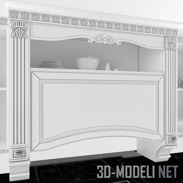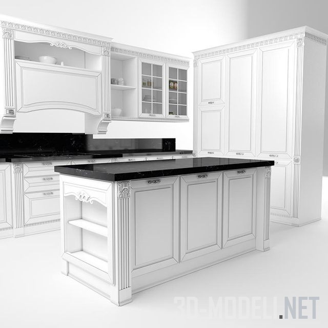 Классическая белая кухня Dolce Vita с черной столешницей и обильным резным декором с чернением во впадинах. Производитель – итальянская фабрика Stosa Cucine. Кухня состоит из острова с рабочей поверхностью, трехсекционным шкафом с системами хранения и большим блоком с нижним ярусом, рабочей поверхностью с мойкой и варочной поверхностью, а также навесными шкафами со встроенной вытяжкой.