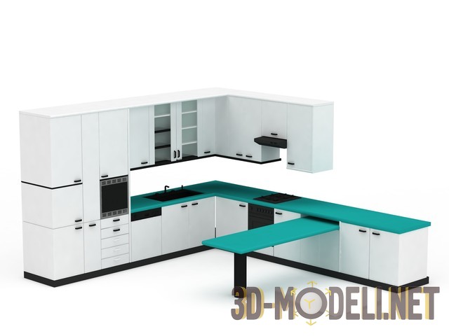 3D-модель белой кухонной мебели, оснащенной выдвижной поверхностью. Угловая конструкция, с удобным расположением мойки. Актуальное сочетание цвета делает мебель свежей и современной.