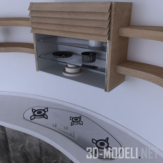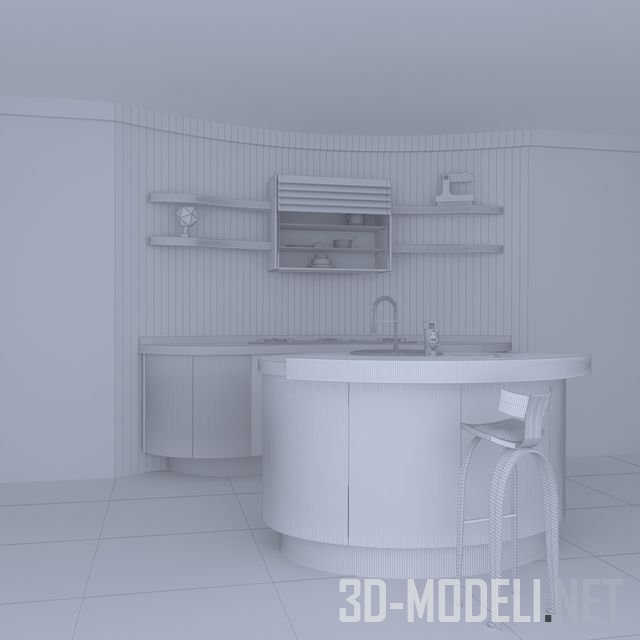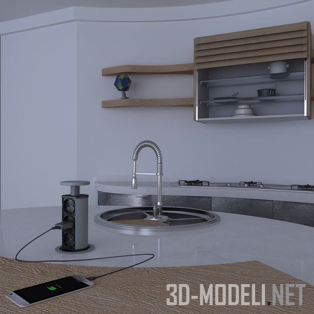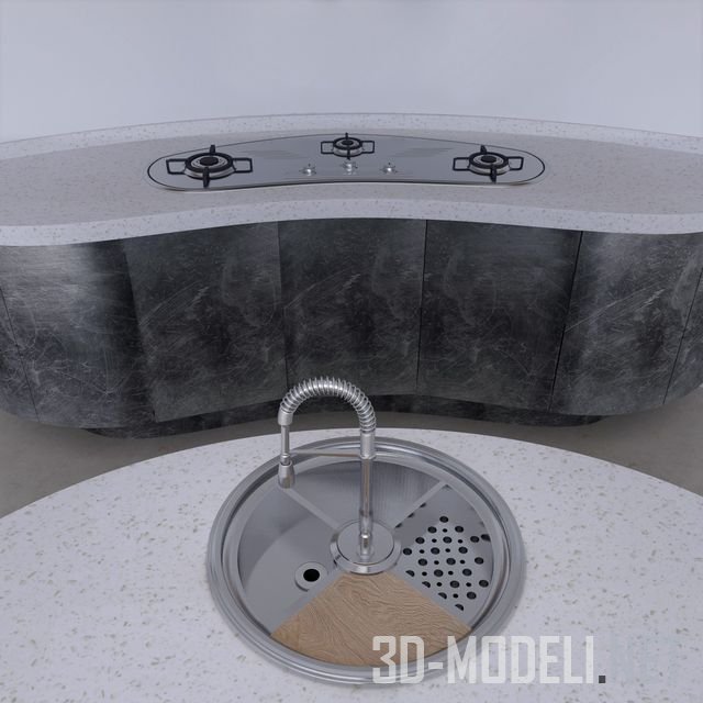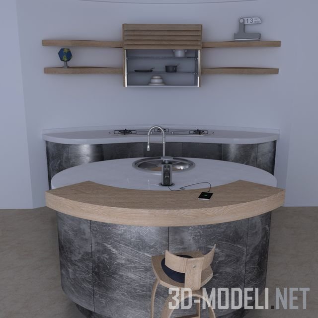 Островная кухня круглой формы и с пристенной частью, на которой размещена варочная поверхность. Кухня имеет комбинированную столешницу, на которой органично сочетаются светлый искусственный камень и светлое дерево. Боковые стенки острова, отделанные брашированным металлом, придают мебели стильный и современный вид.